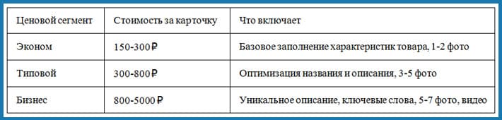 Бизнес-вариант подразумевает создание продающих карточек с высокой конверсией. Разумеется, встречаются предложения и по 25 тысяч (и выше). В таблице приведены наиболее распространенные запросы.